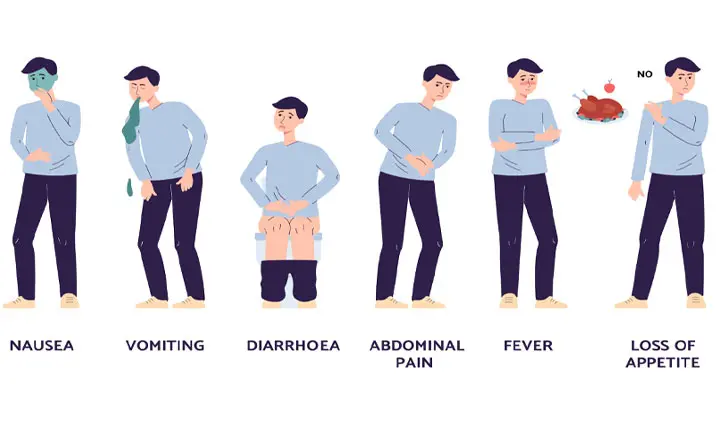 Symptoms of food poisoning vary according to the source of infection. First symptoms may appear as soon as 1 hour or as long as 28 days after consumption of contaminated food. Common cases of food poisoning will typically include at least three of the following symptoms: