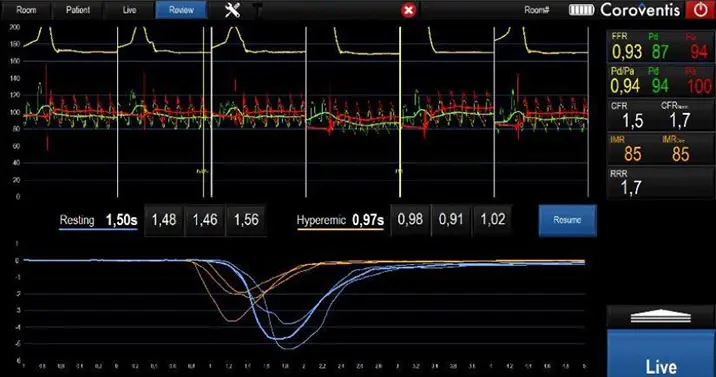 现在有一种新的检测方法,利用 Coroventis 生理系统等设备来评估微血管疾病。它与有创冠状动脉造影同时进行,将一根特殊的压力导线插入冠状动脉。然后使用热稀释技术测量微血管生理状况。测得的肌内阻力(IMR)将为 CMD 提供客观评估。在有经验的手部,通常需要在冠状动脉造影影片期间额外花费 10 - 15 分钟进行测试。